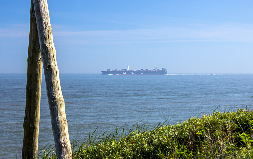 Das 399 Meter lange Containerschiff »MSC Amsterdam« ist hier gerade mit auf dem Weg von Wilhelmshaven nach Bremerhaven – verglichen mit anderen Touren eine echte Kurzstrecke! 2015 wurde das Schiff gebaut, es fährt unter der Flagge Panamas für die Reederei »Mediterranean Shipping Company« (MSC) und kann maximal 16.652 Standardcontainer transportieren.