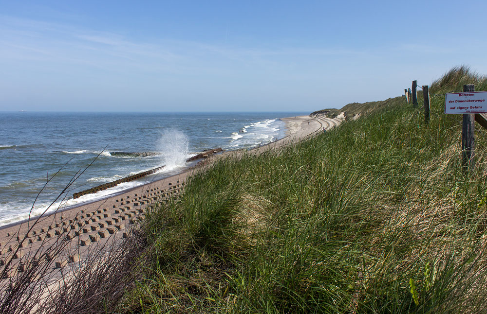 Das unberührte Westdeckwerk liegt vor uns. Mittlerweile sind die Bautätigkeiten in diesem Bereich in vollem Gange, die Dünen wurden planiert und begradigt und das alte Deckwerk wurde durch eine neue Schicht Sand und Steine deutlich erhöht.
