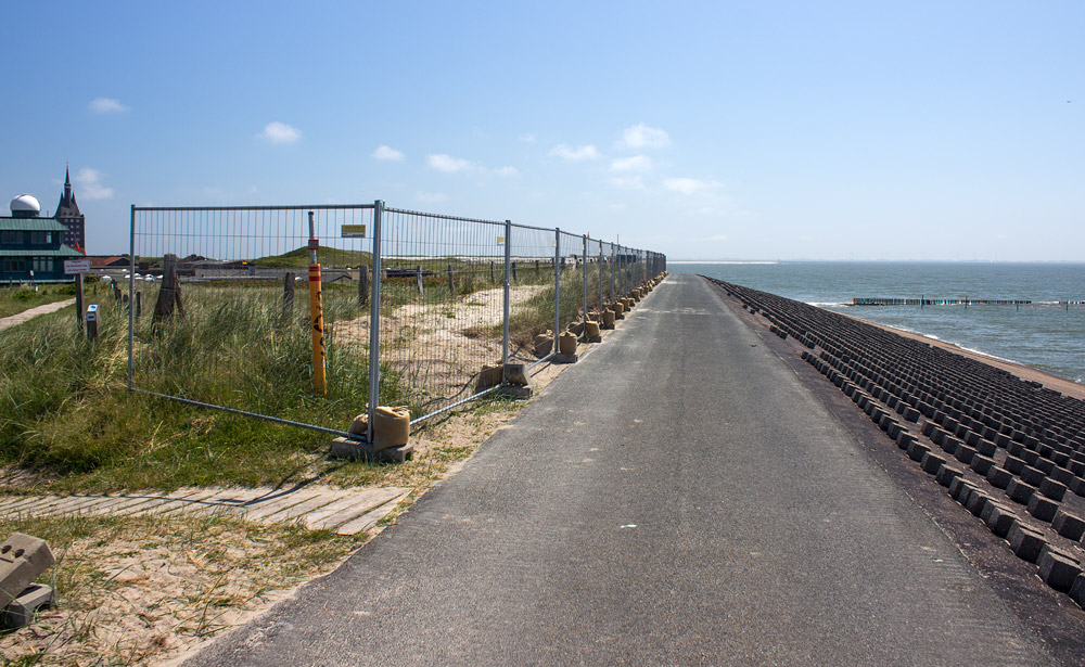 Zwar starten die Deckwerksarbeiten deutlich später als geplant, der Bauzaun wurde aber dennoch bereits im Jahr 2016 aufgestellt. So sind immerhin die Dünen besser vor dem Betreten geschützt…