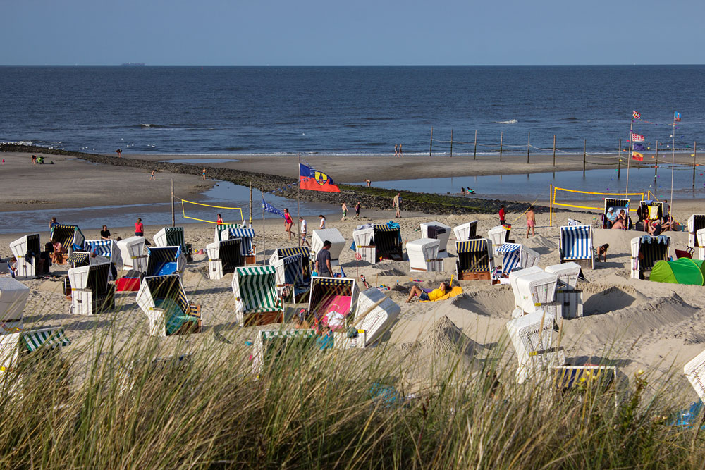 Strandkörbe, Sandburgen, sich sonnende Menschen, Spaziergänger, Volleyballspieler und das Meer – all das sieht man an einem typischen Strandtag an der Nordsee.