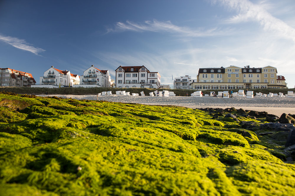 Wir befinden uns nun auf der Buhne »O«, die sich östlich des Hauptbadefelds befindet. Im Hintergrund ist der Bade- und Burgenstrand zu erkennen, direkt an der Strandpromenade befinden sich, von links nach rechts, das »Haus Marina«, der »Kaiserhof«, das »Alexandra« und das »Strandhotel Gerken«, damals noch zur »Upstalsboom«-Gruppe gehörte.