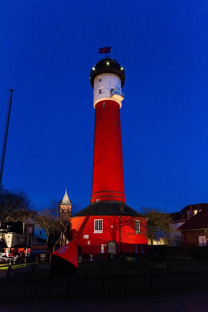 ‹ Welch ein farbenfrohes Bild der rot angestrichene Alte Leuchtturm im Zusammenspiel mit dem tiefblauen Abendhimmel abgibt. Im Hintergrund ist außerdem der Kirchturm der Nikolaikirche zu erkennen.