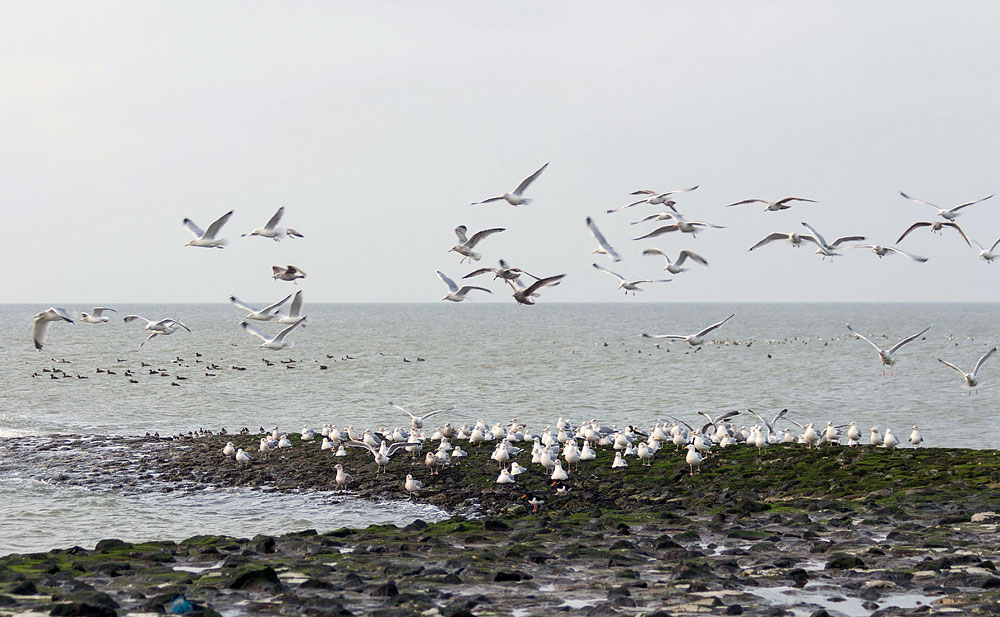 Auf dieser Buhne im Westen der Insel haben sich zahlreiche Silbermöwen nieder gelassen. Einige davon sind soeben aufgeflogen.