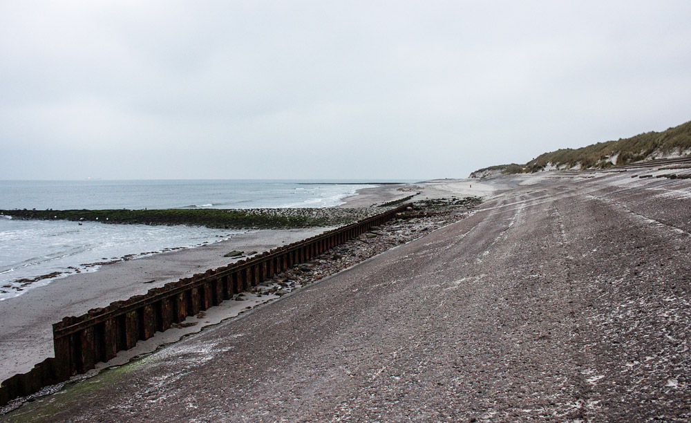 Links die Buhne »G«, welche 1877 und 1884 erbaut wurde. Auffällig ist, daß sich links und rechts der Buhne eine Spundwand befindet, zumindest war dies vor der Deckwerkssanierung der Fall.