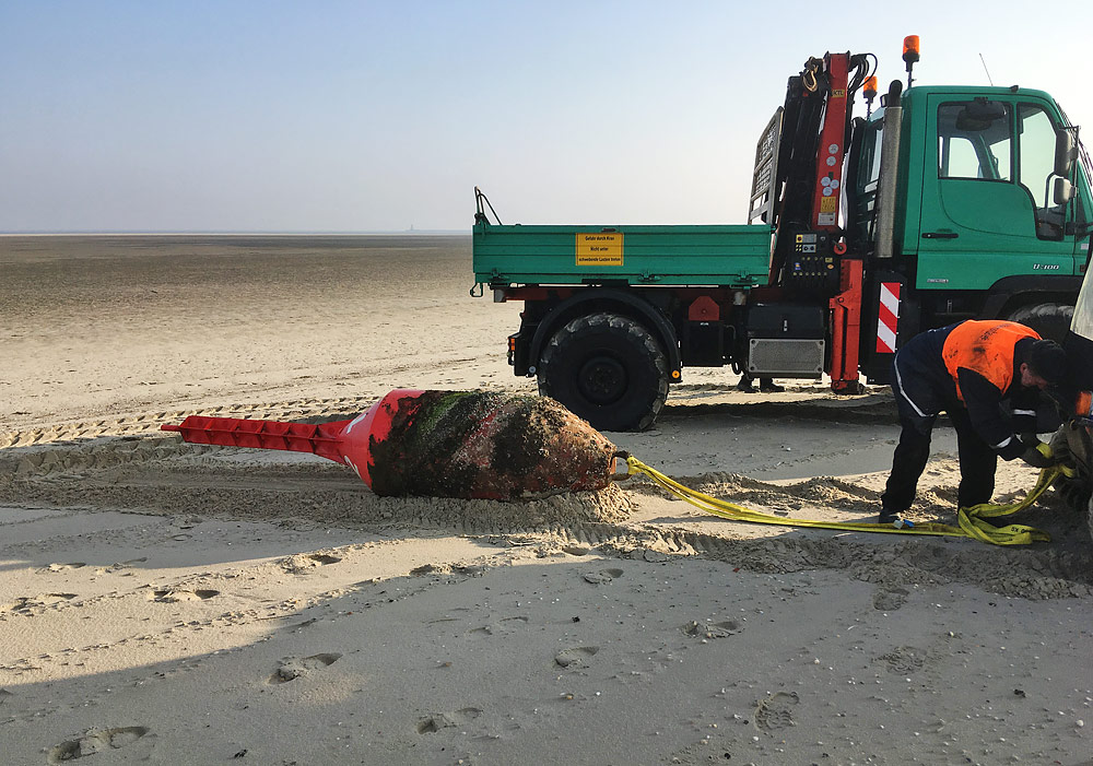 Am Ostende wurde eine Backbord-Spierentonne angetrieben. Um sie zu bergen, wurde sie erst einmal etwas weiter auf den Strand hinauf gezogen.