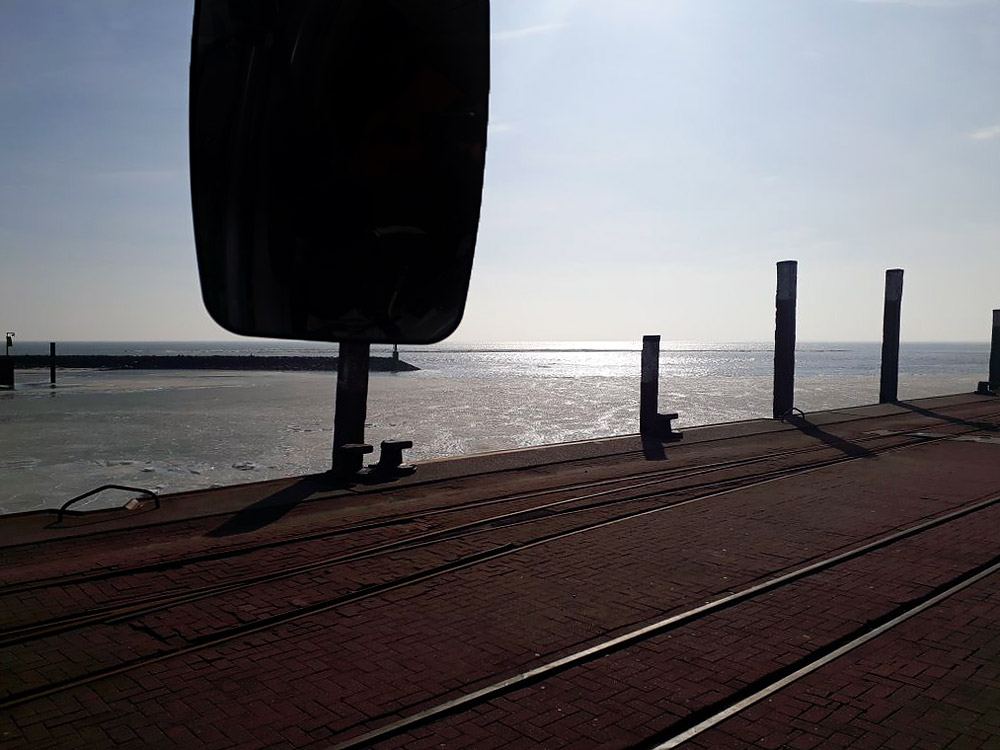Blick vom Fahrersitz des grünen WSA-Unimogs – der Rückspiegel verrät es – aufs östliche Hafenbecken, das vollständig von Eisschollen bedeckt ist.