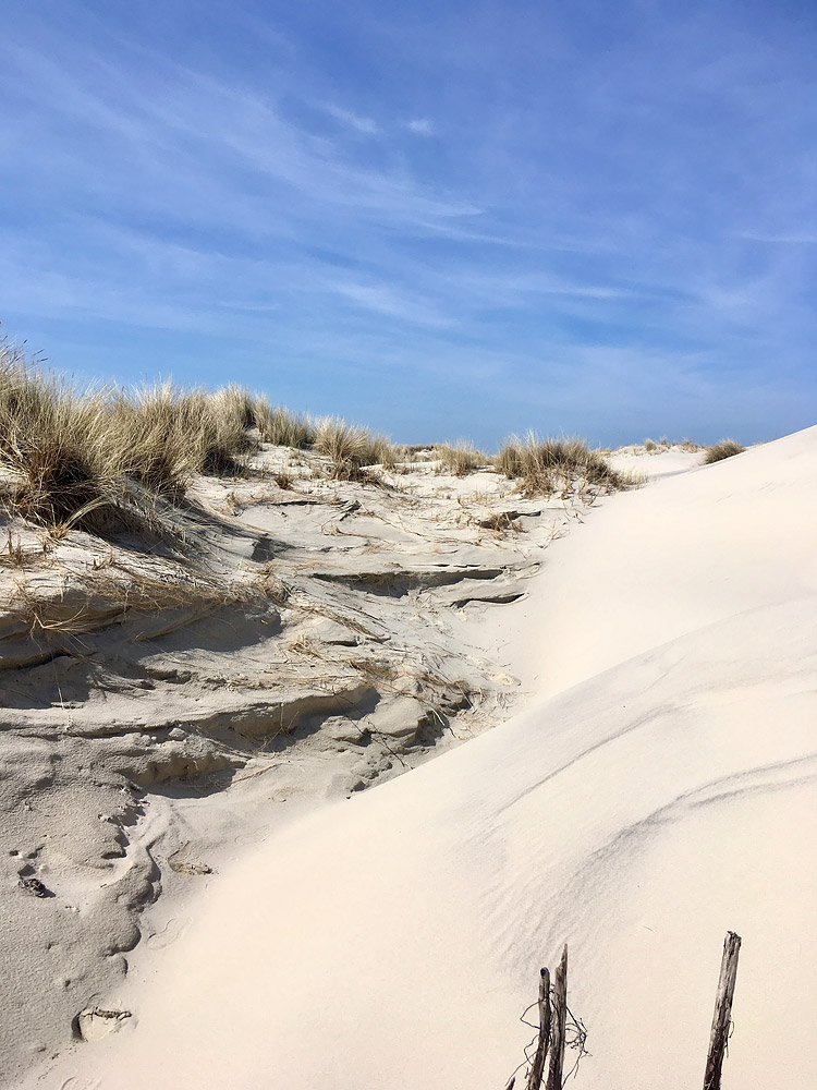 ‹ Die Weißdünen im Ostteil der Insel werden von Zeit zu Zeit mit Flugsand überdeckt, auf diese Weise wachsen die Dünen nach und nach – sollte der Sand nicht wieder von einer Sturmflut fortgerissen werden.