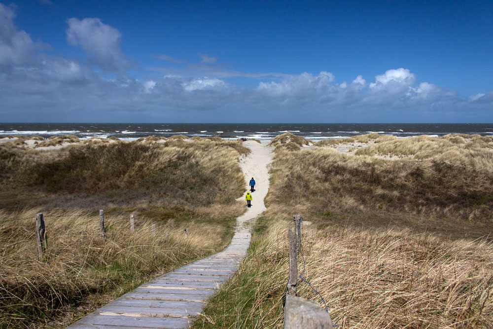 Blick von der Dünenüberwegung auf die Vordünen im Osten, gerade überqueren zwei Spaziergänger die Dünen.