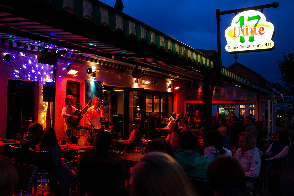 Mehrfach in der Saison tritt das Duo »West Coast Twins«, bestehend aus den Gitarristen Uwe Mannsbarth und Thomas Glaser, vor der »Düne 17« in der »Zedeliusstraße« auf. Wie auch an diesem Abend kommt die Musik bei den Zuhörern sehr gut an, auch von der Straße aus schauen zahlreiche Gäste und Insulaner zu.