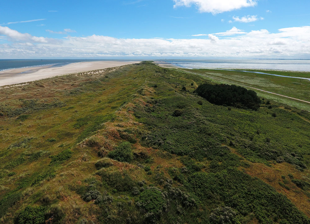 Im Osten ist die Insel relativ schmal, sie besteht im Wesentlichen aus einer Dünenkette, die nach Osten hin immer schmaler wird. In der rechten Bildhälfte sehen Sie außerdem das Kiefernwäldchen, das sich zwischen den Überwegungen »Neudeich« und »Ost I« befindet.