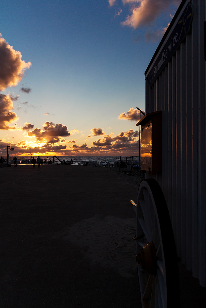 ‹ In der Badekarre unterhalb der Kurverwaltung befindet sich der sogenannte »Strandservice«, sprich: der Strandwärter. Jetzt am Abend genießt er natürlich längst seinen wohlverdienten Feierabend.