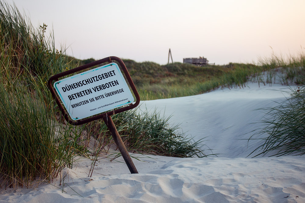 Halb eingewehtes Schild in den Ostdünen nahe der Dünenüberwegung.