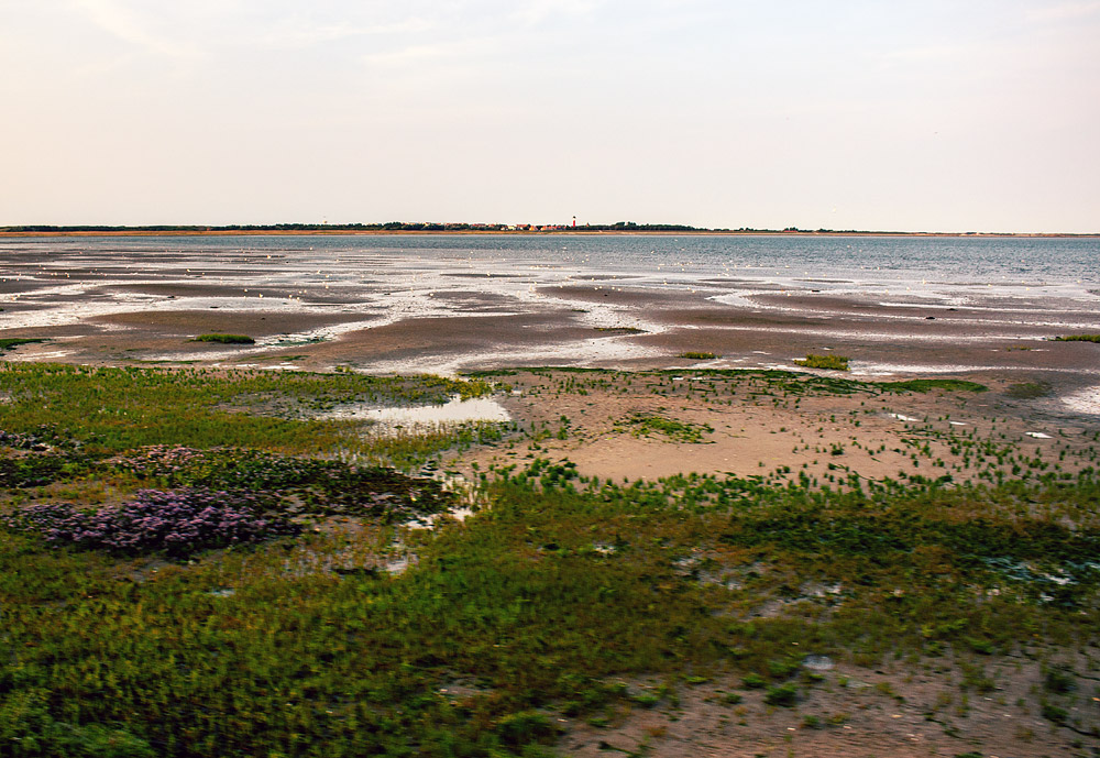 Vom fahrenden Zug aus blicken wir hier, übers Watt hinweg, zum Inseldorf.