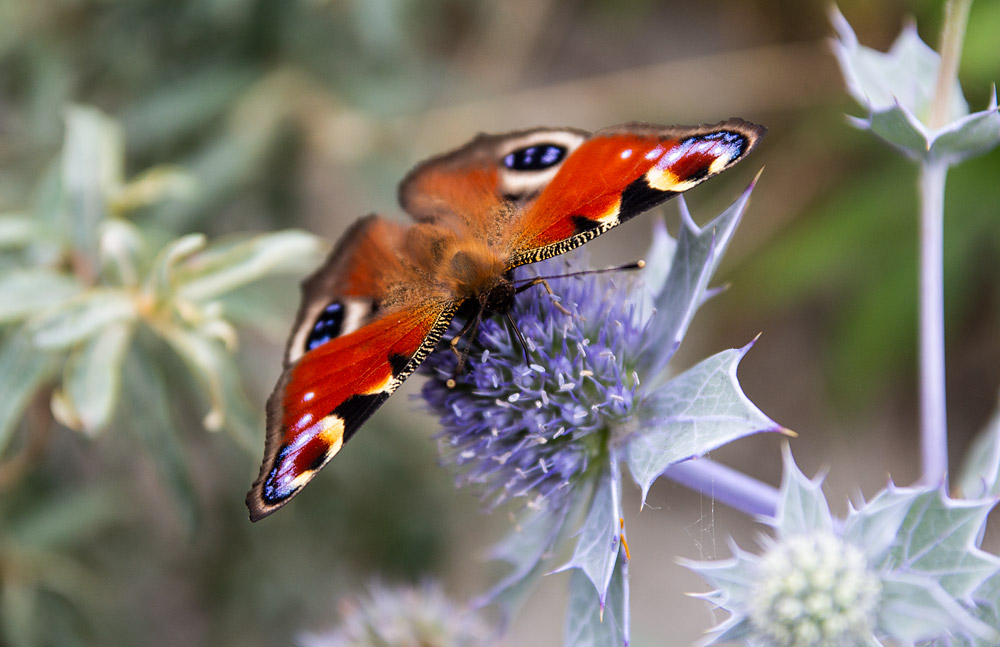 Der orange-rote Schmetterling bildet zur bläulichen Stranddistel einen wunderbaren Farbkontrast. Ein Bild, das man nicht überall fotografieren könnte, denn die Stranddistel ist stark gefährdet und besonders geschützt.
