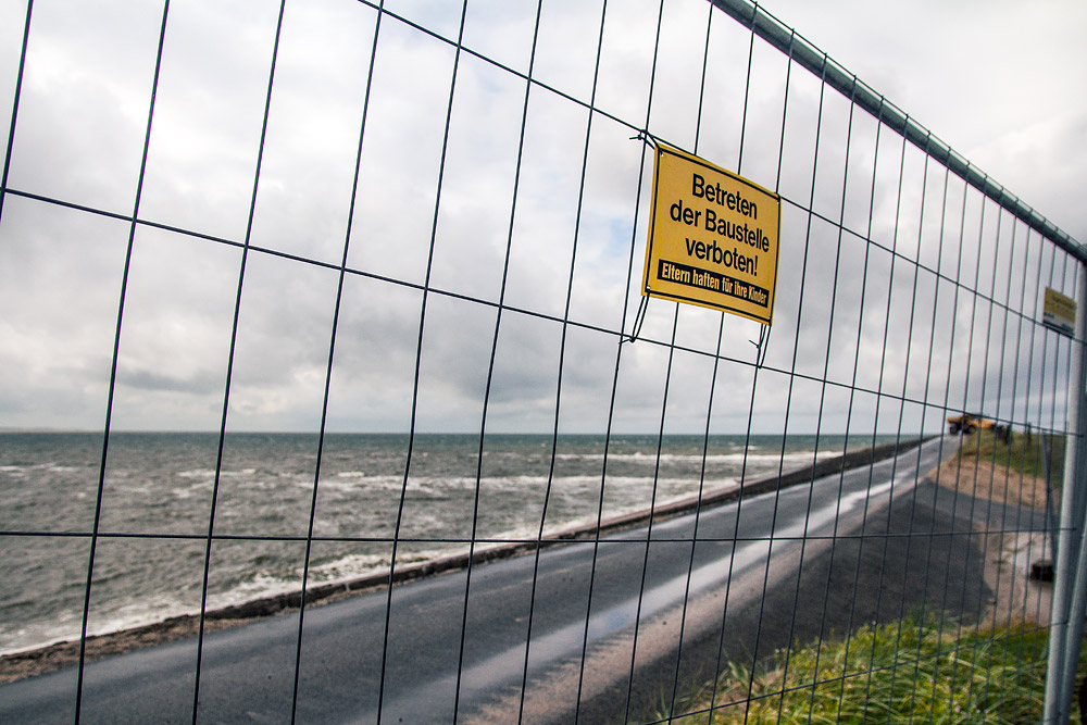 Während der Deckwerks-Bauarbeiten schützt ein langer Bauzaun die Baustelle vor dem Betreten, selbst an Stellen, an denen noch längst nicht gebaut wird. Grund dafür sind regelmäßige Materialtransporte auf dem Westdeckwerk.