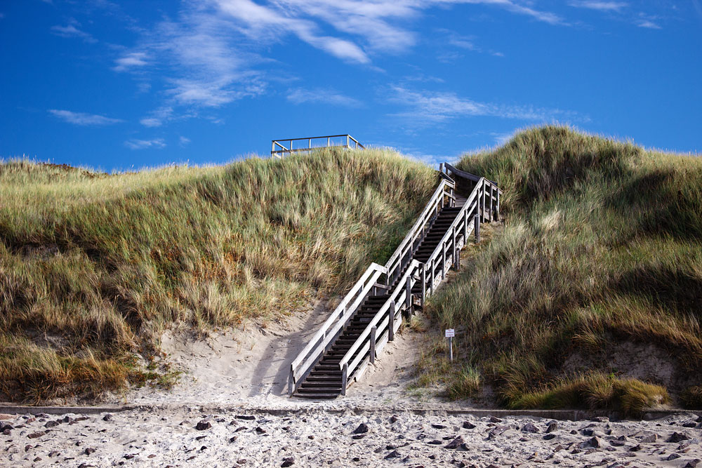 Die steilen Dünen nördlich des »Bielefelder Heims« sind ausschließlich über eine Treppe passierbar. In der Bildmitte ist außerdem eine Aussichtsplattform sichtbar, die ebenfalls zur Überwegung gehört.