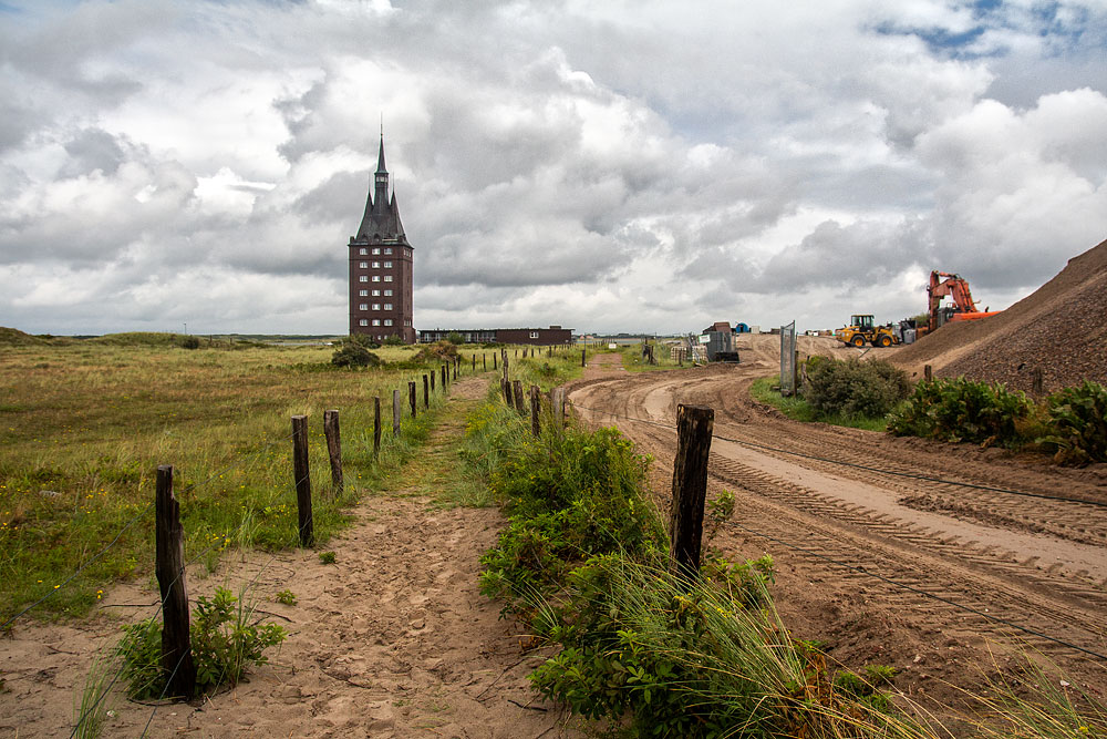 Neben dem Dünenweg, der vom Deckwerk in Richtung Westturm führt, befindet sich eine Baustraße, auf der regelmäßiger Fahrzeugverkehr herrscht. Die Baustelle, die wir rechts im Bild sehen, wurde im Rahmen der Deckwerks-Sanierung eingerichtet und ist eigentlich nur ein Ablage- und Parkplatz für Material und Baufahrzeuge.