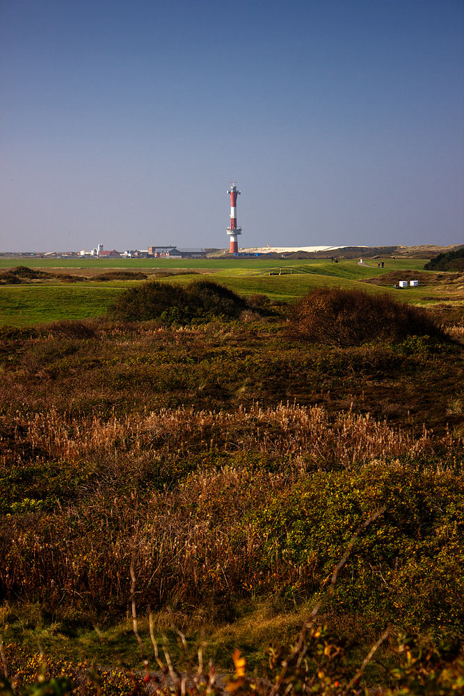 ‹ Bei einem Blick nach Westen sehen wir die Heidedünen-Landschaft nahe des Süddeichs, den Neuen Leuchtturm und Teile des Westdorfes.