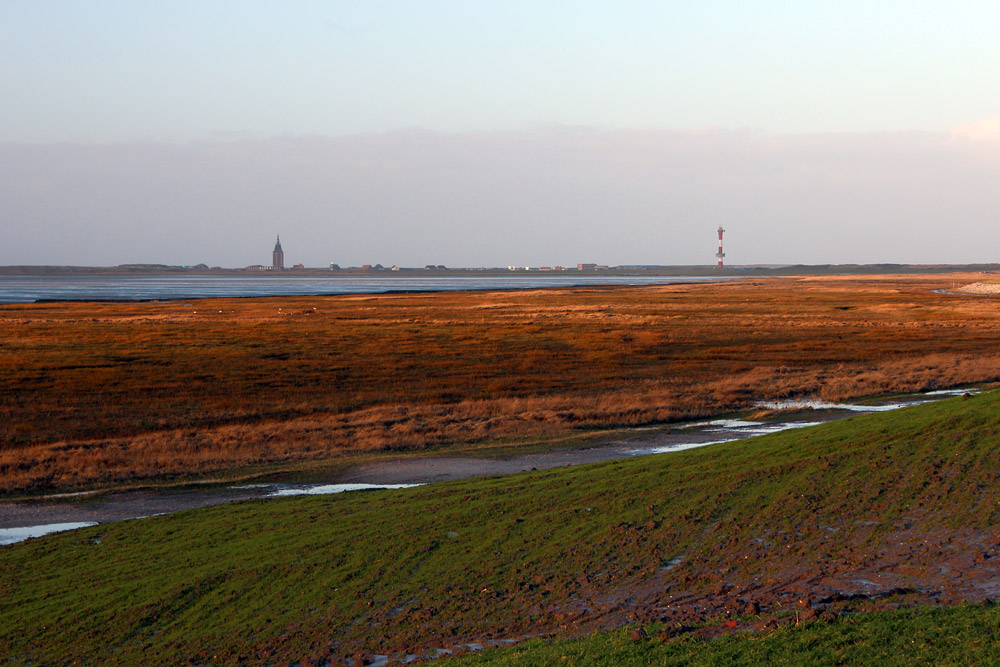Während die Salzwiesen im Sommer in einem frischen Grün erstrahlen, hat sich die Farbe zum Winter hin in Richtung Orange-Braun geändert.