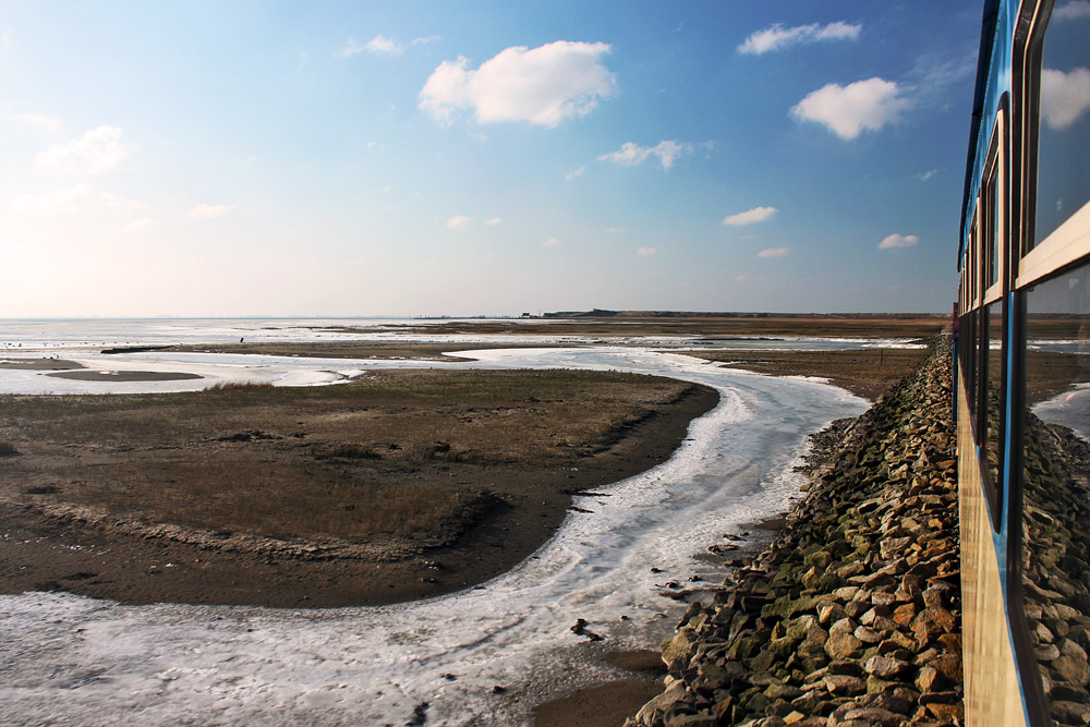 Es ist Winter, auf der Inselbahn-Fahrt zum Westanleger passieren wir die Aalkuhlen, welche zum Teil von einer Eisschicht bedeckt sind.