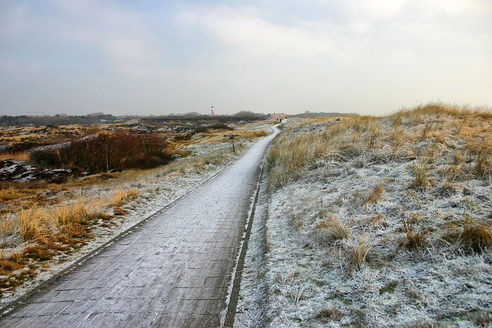 Hier ein frostiger Blick zurück in Richtung Dorf, der Alte Leuchtturm im Hintergrund ist schon ein Stückchen entfernt.
