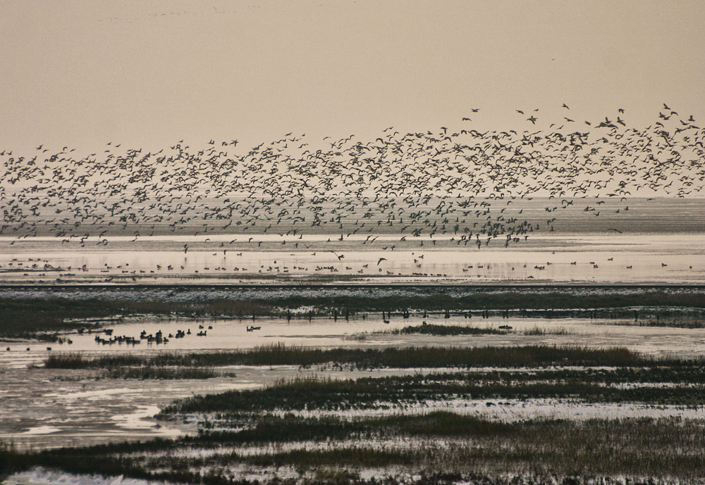 Über den Salzwiesen des Deichvorlands steigt ein Schwarm Möwen auf. Vorn sieht man außerdem die Aalkuhlen, in deren Prielen einige Enten schwimmen.