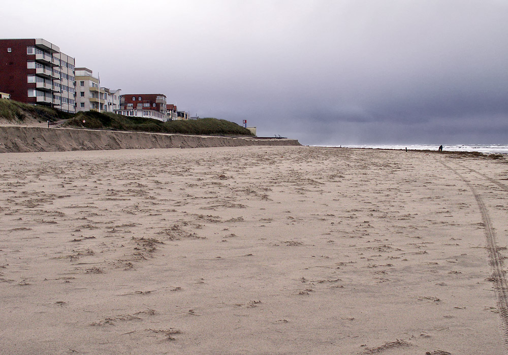 Dieses Foto entstand im Bereich des Strandkorb-Ostfelds. Die Abbruchkante reicht nach der Allerheiligenflut 2006 bis fast an die Strandmauer heran, im Frühjahr muß also wieder kräftig Sand aufgefahren werden.