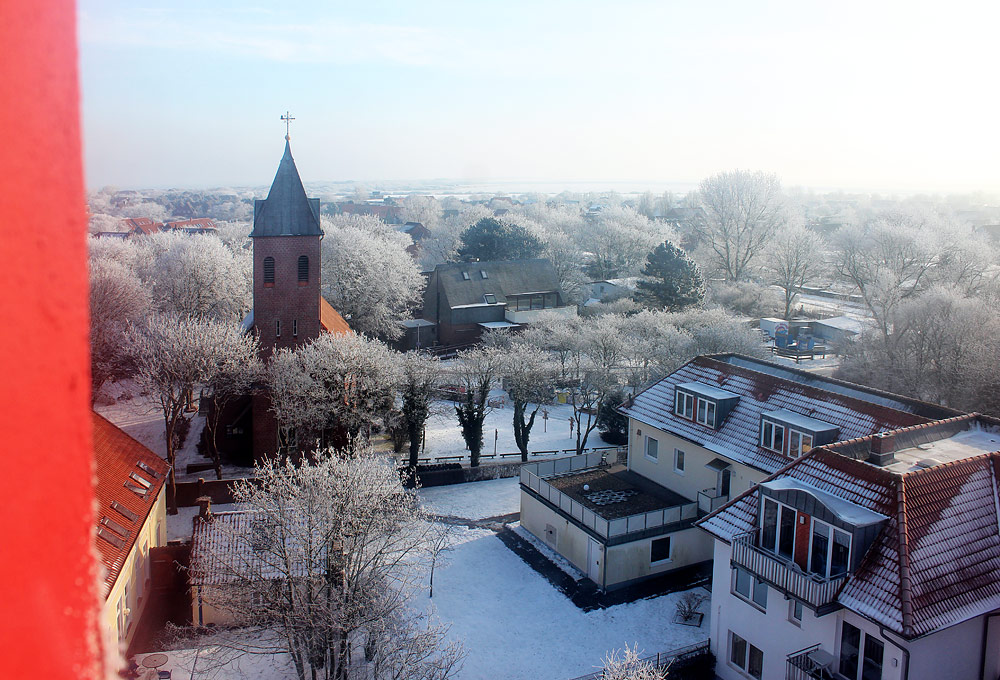 Hier schauen wir aus einem Fenster des Leuchtturms nach Osten, links erkennt man die rot gestrichene Fensterlaibung. Wir erblicken die evangelische Kirche, das Gemeindehaus und, unten rechts, die Rückseite der Börse.