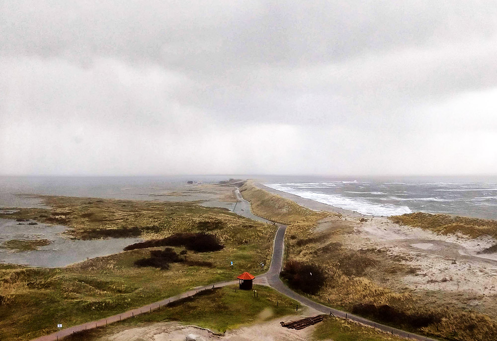Eine Sturmflut im Januar 2019 brachte der Nordseeküste hohe Wasserstände. Hier beim Blick aus einem der Westturm-Fenster sind die überfluteten Salzwiesen und die Straße zum Westanleger zu erkennen, rechts davon die Harle Hörn-Dünen.
