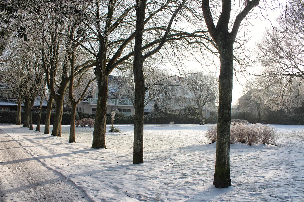 In idyllisches Bild gibt die Kastanien-Baumreihe in Kombination mit der Schneedecke im Dorfplatz ab.