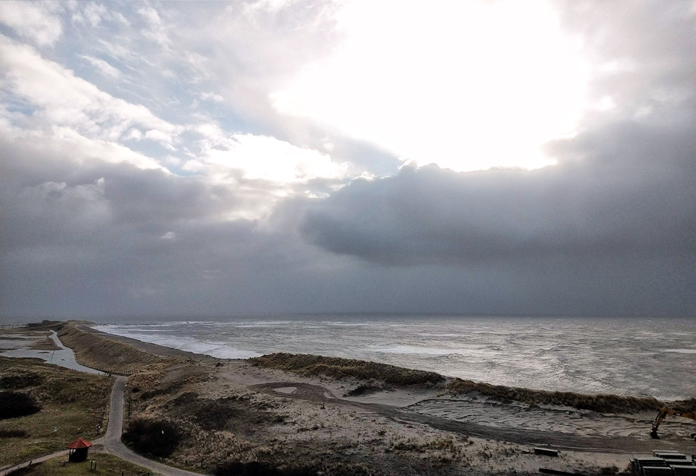 Blick aus einem Fenster des Westturms auf die Harle Hörn-Dünen. Das Wasser steht sehr hoch, sogar die Straße zum Anleger steht unter Wasser.