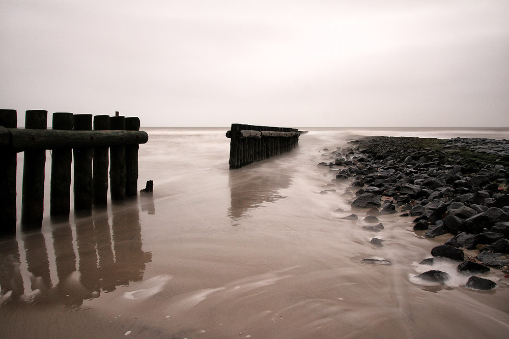 Dieses beeindruckende Foto ist direkt an der Seebuhne »M« entstanden. Die lange Belichtungszeit läßt dabei aus der Brandung eine Art Nebel werden.