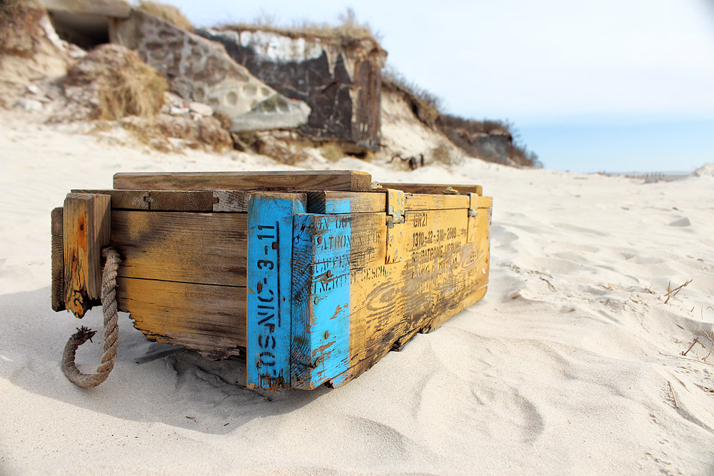 In solchen hölzernen Munitionskisten wurden von der Bundeswehr Patronen transportiert, in diesem gelb-blauen Strandgut-Exemplar beispielsweise Übungsmunition.