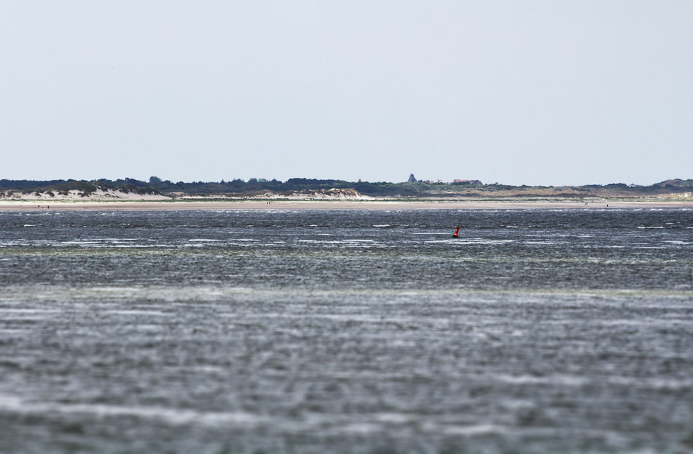 Über das Seegatt Harle hinweg zur Nachbarinsel Spiekeroog geblickt. In der Bildmitte erkennt man das charakteristische Dach der katholischen Inselkirche »St. Peter«, die 1971 erbaut wurde. Wegen ihrer Zelt-Architektur bezeichnet man sie auch auch als »Zelt Gottes in den Dünen«.