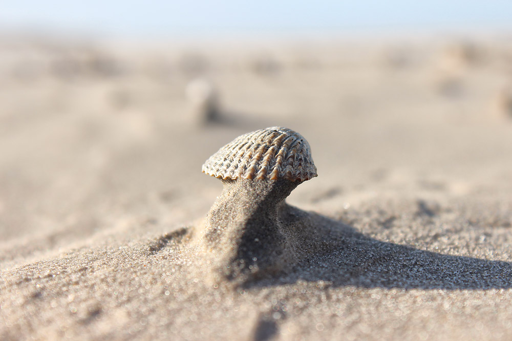 Die Schale einer Herzmuschel thront über dem sie umgebenden Sand des Strandes. Grund dafür ist der Wind, der fortwährend die obere Sandschicht wegweht, zurück bleibt eine säulenartige Struktur unter der Schale, die irgendwann zu filigran wird und bricht.