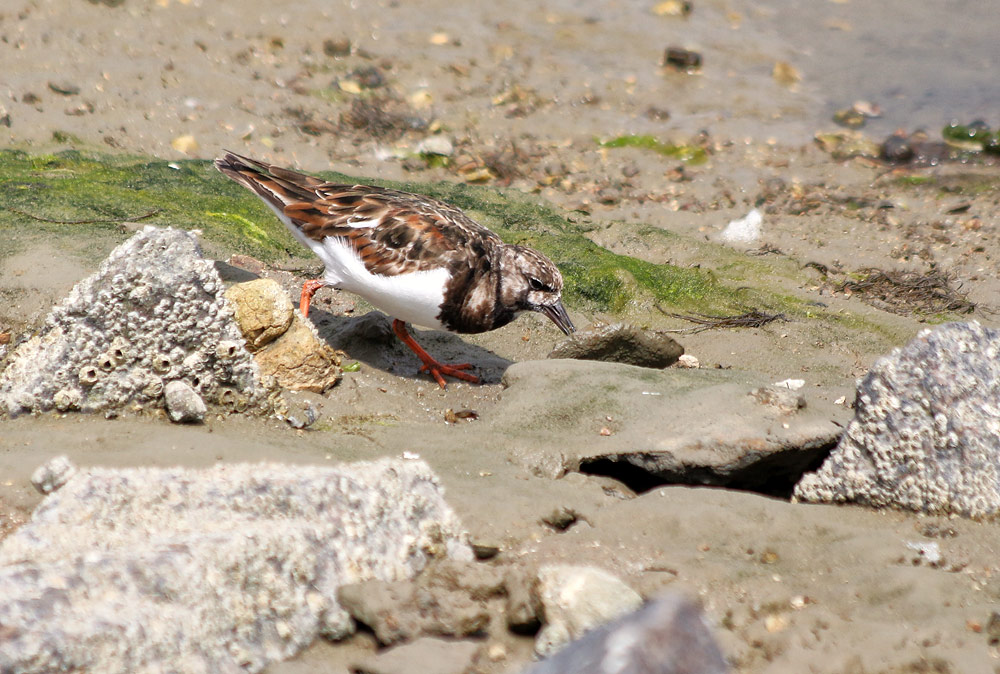 Hier sehen wir den Steinwälzer bei seiner Lieblingsbeschäftigung: Dem Steine umdrehen. Vielleicht verbirgt sich ja unter einem der Steine der eine oder andere Leckerbissen.