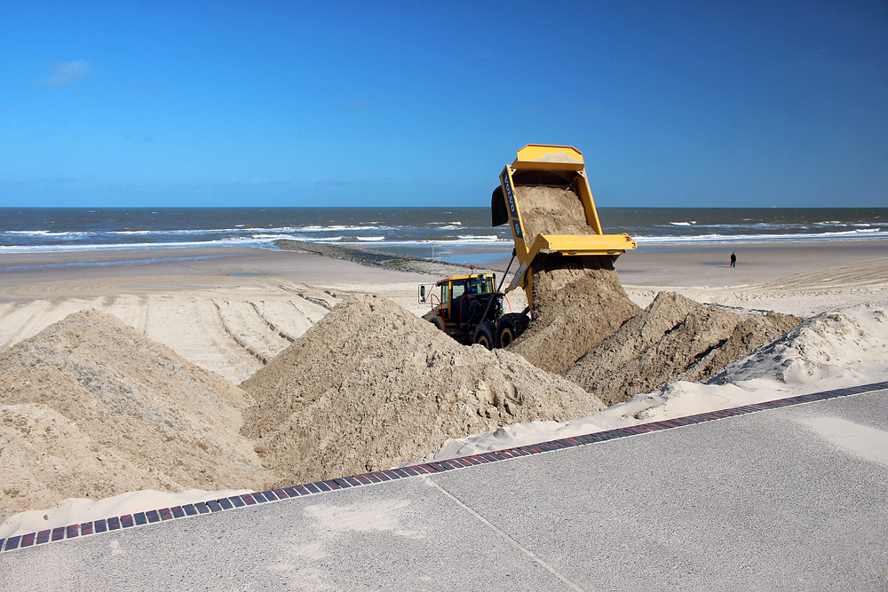 Langsam rutscht der Sand von der Ladefläche herunter. Wieder ein Stück Hauptstrand mehr für diese Saison, doch unzählige Fahrten müssen noch folgen, bis der Strand vollends wieder hergerichtet ist.