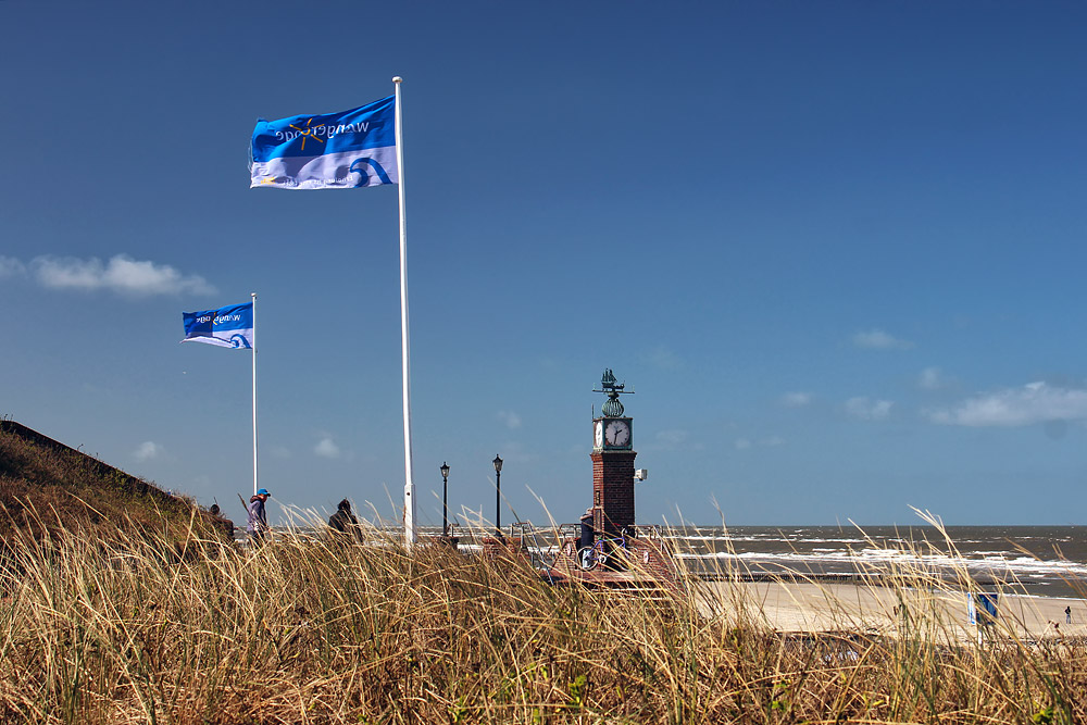 Blick auf Uhr und die im kräftigen Nordwind wehenden Wangerooge-Flaggen.
