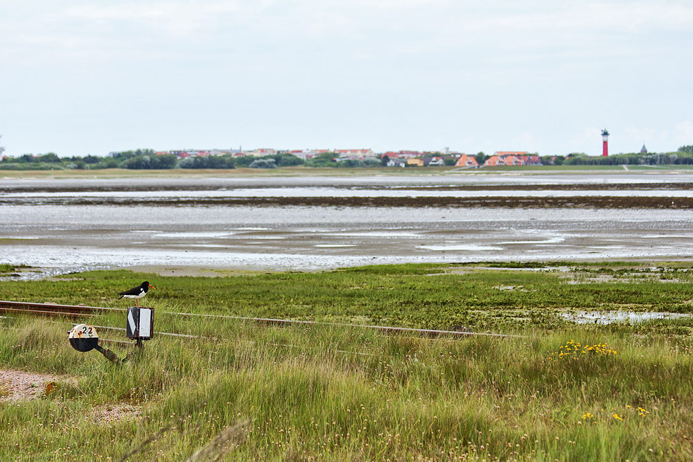 Hier noch einmal ein Blick auf den Austernfischer, der sich auf einem Weichensignal am Rande des Watts niedergelassen hat. Im Hintergrund erkennt man das Inseldorf mit Altem Leuchtturm.