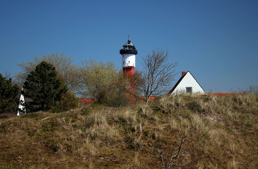 Beim Blick aus den Osterdünen nach Westen sehen wir den nahe gelegenen Alten Leuchtturm, der gerade von zahlreichen Personen bevölkert wird.