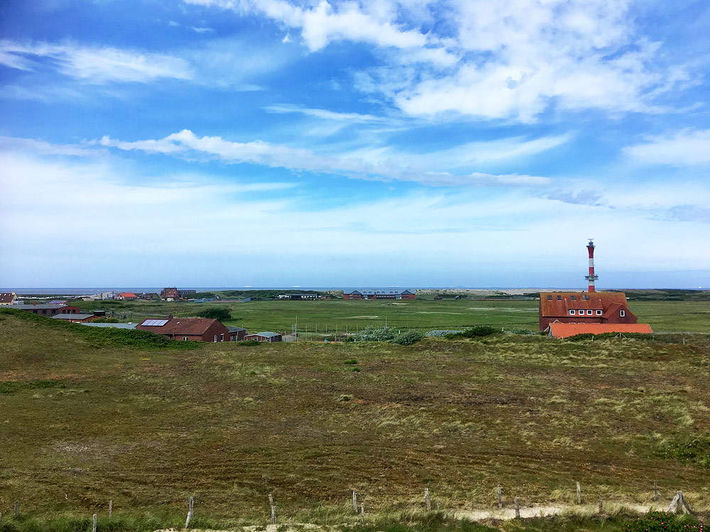 Von erhöhter Warte aus aufs Westdorf geblickt, links sehen Sie einige der Schullandheime, rechts das Westturm-Café und im Hintergrund den Neuen Leuchtturm.