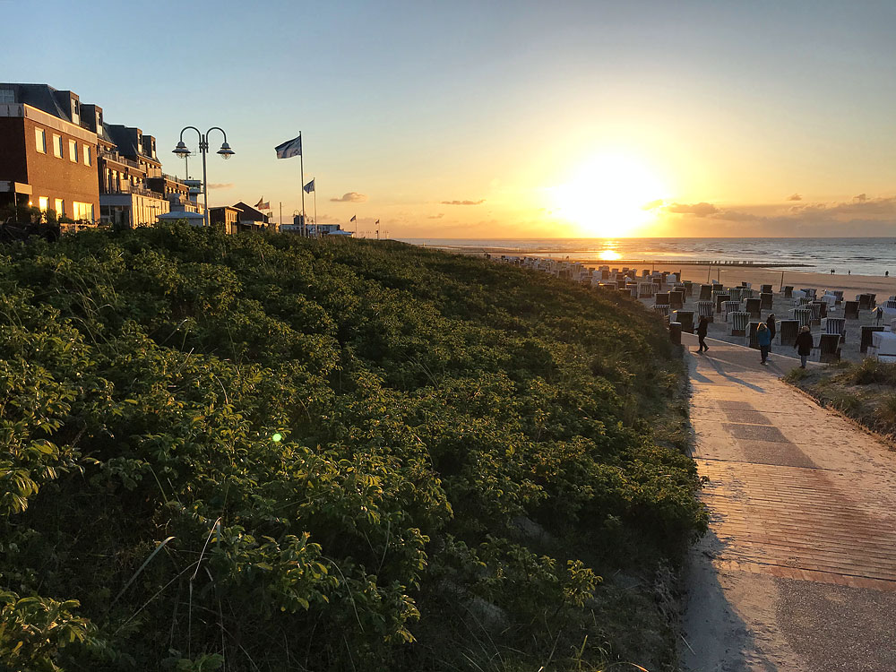 Wunderbares, sonniges Wetter herrschte an diesem Abend des 10. Mai auf der Insel. Wir stehen hier auf der Promenade und blicken in Richtung Strandkorb-Westfeld, der Sonne entgegen.