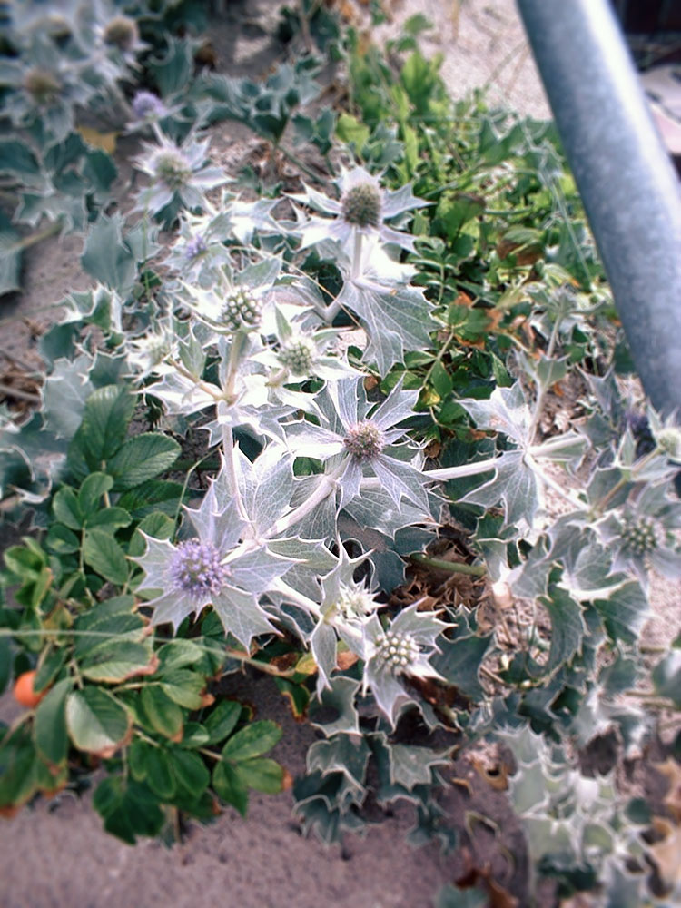 ‹ Zwischen einigen Ausläufern der Kartoffelrose wachsen hier auch ein paar Stranddisteln, die mit ihren bläulich schimmernden Blättern sofort ins Auge fallen.
