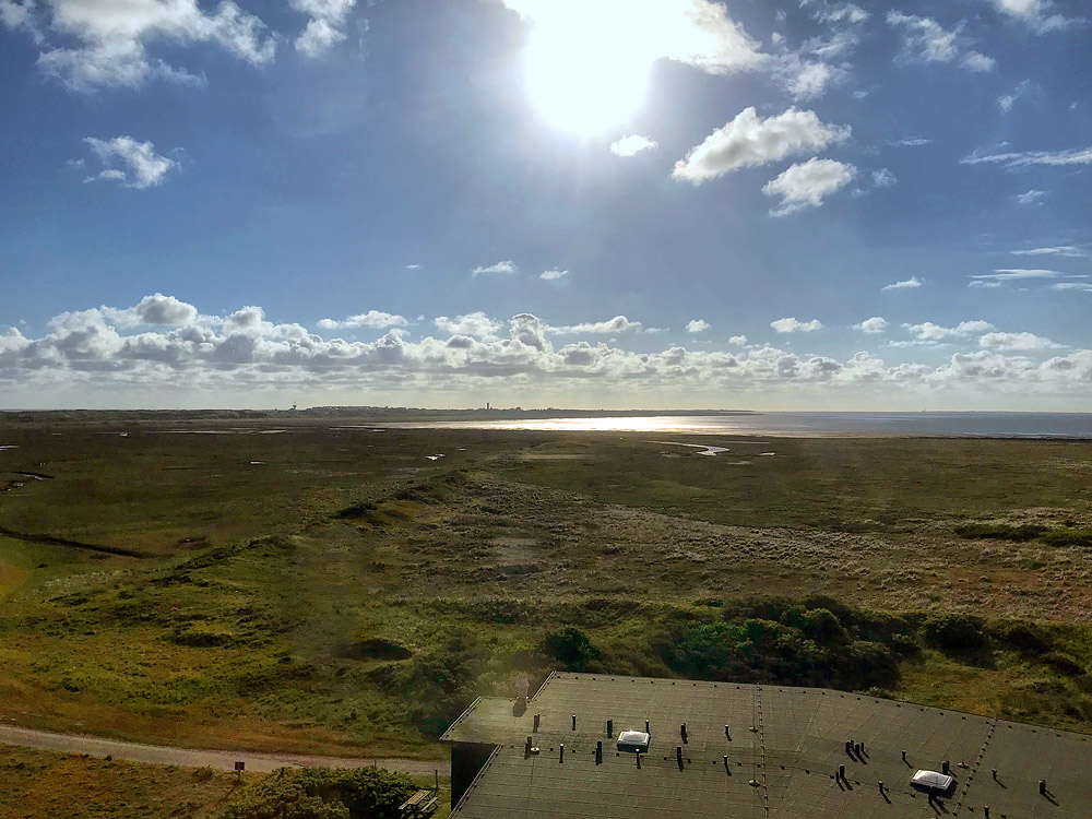 Ein Frühmorgen-Blick nach Osten auf den Westaußengroden mit den Sporndünen. Im Hintergrund spiegelt sich die Sonne in der Salinebucht.