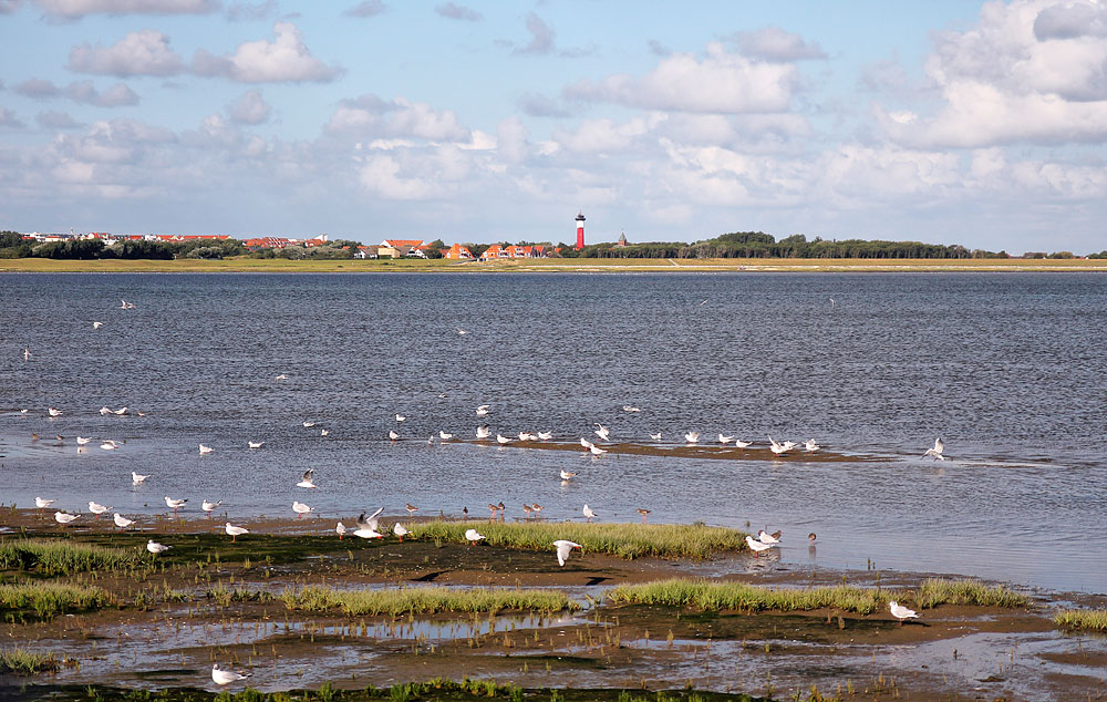 Über die Salinebucht hinweg zum Inseldorf mit Altem Leuchtturm geblickt.