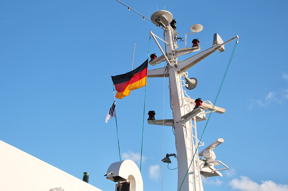 Der Schiffsmast der MS Wangerooge trägt nicht nur einige Positionslichter, sondern auch Radargeräte und natürlich auch die Flaggen der Bundesrepublik und der Deutsche Bahn-Reederei.