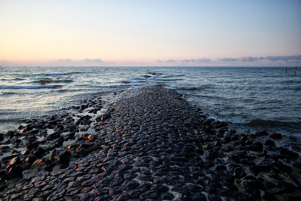 Die aus Basaltsäulen bestehende Buhne »N« direkt westlich des Hauptbadefelds wird von kleinen Wellen umspült.
