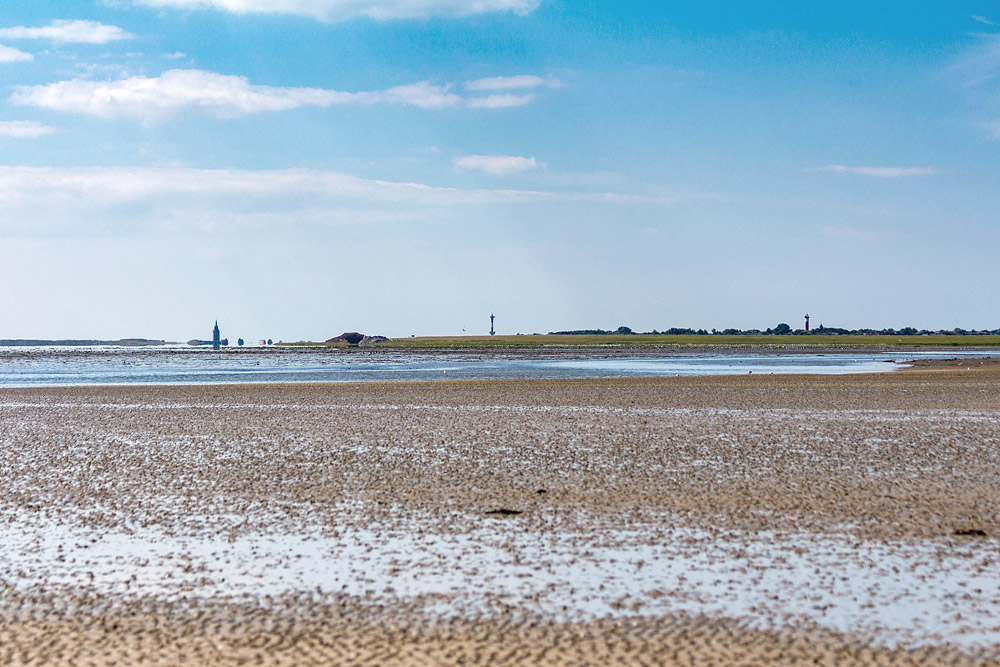 Bei Niedrigwasser fallen große Teile des Watts trocken, so auch hier im Osten der Insel. In der Ferne sieht man, in scheinbar fast gleichem Abstand zueinander, den Westturm, den Neuen Leuchtturm und den Alten Leuchtturm.