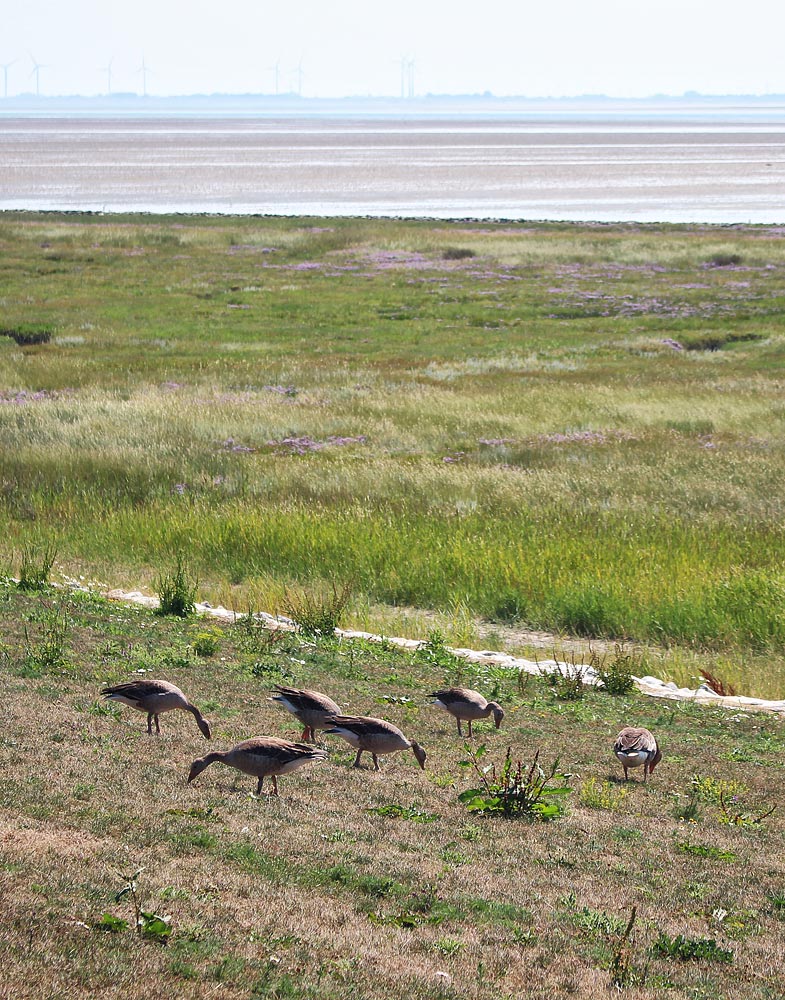 ‹ Nach monatelanger Dürre sind Deich und Salzwiesen ziemlich ausgetrocknet, auch die Graugänse haben Mühe, Eßbares zu finden.