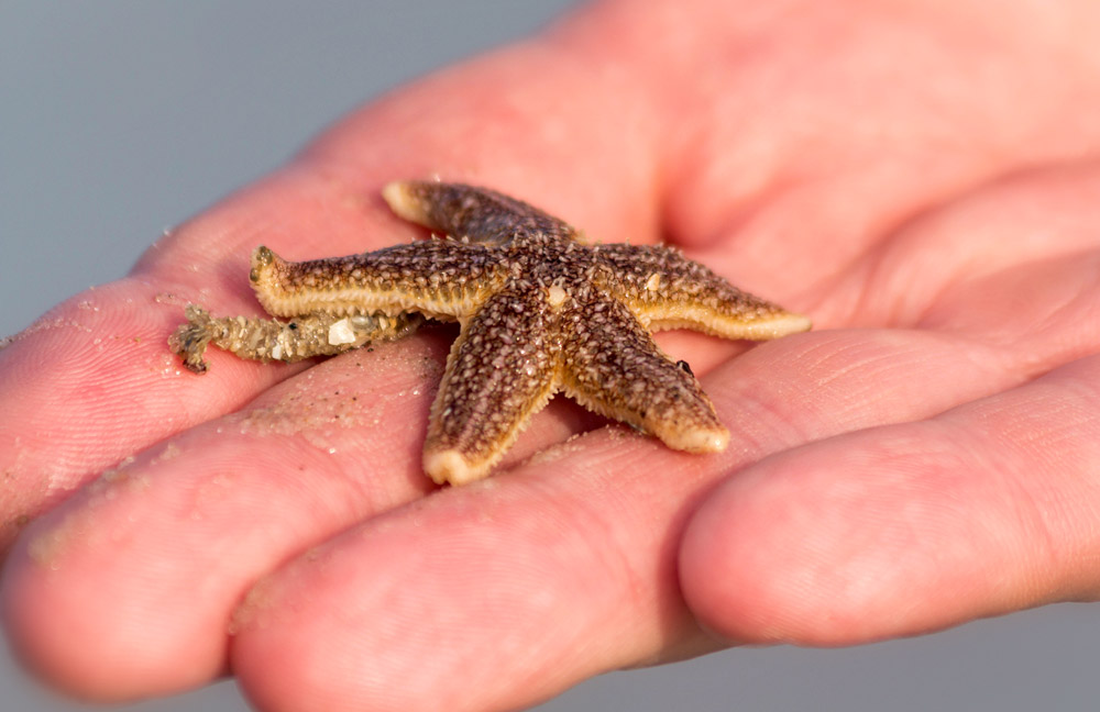 In manchen Jahren findet man bei Niedrigwasser sehr viele Seesterne am Rand der Priele. Hier ein recht kleines Exemplar, die Größe ist durch die Hand gut einzuordnen.